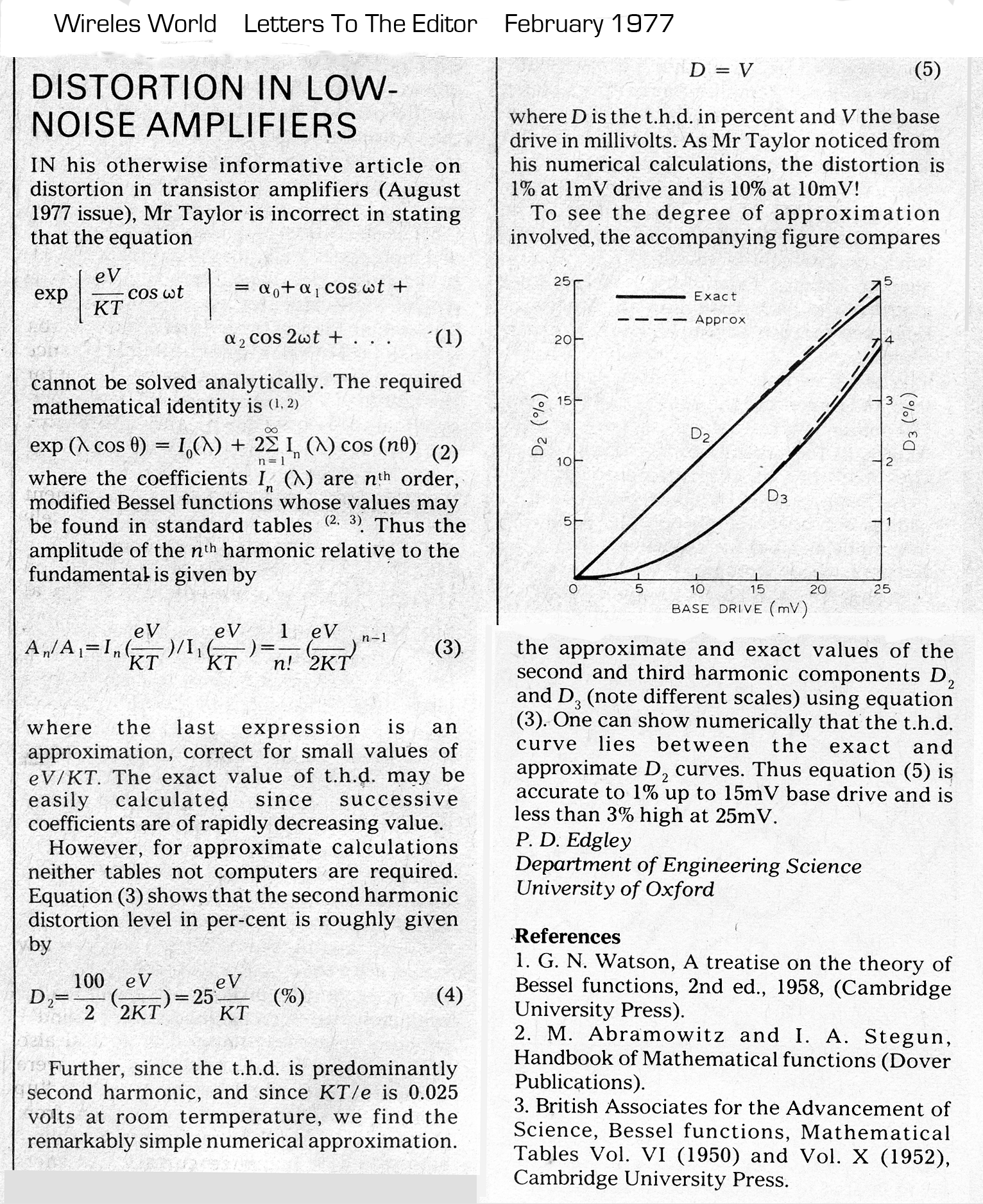At first glance this seems to be hopelessly non-linear, but if we confine v to small values such as 10mV, the picture is somewhat more benign, as might be expected of a power series.